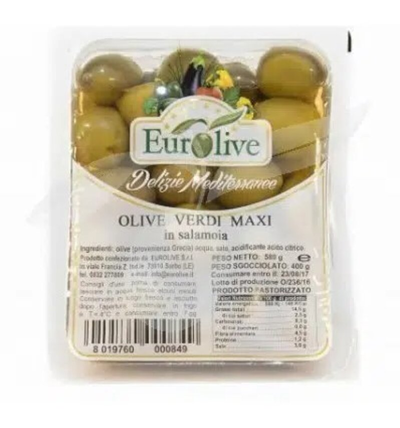 INGREDIENTI: Olive 71% (Origine: GRECIA), acqua, sale, correttore di acidità: acido citrico. Può contenere tracce di lupini.